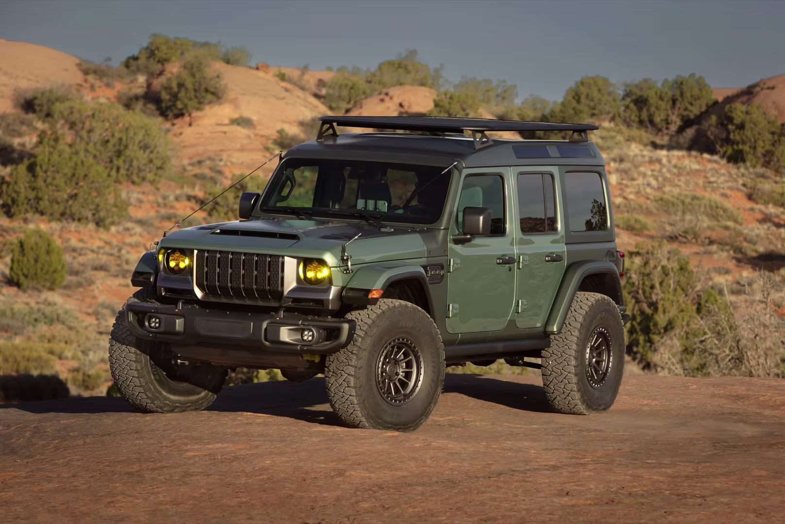 Jeep Wrangler Anvil 715: proposta voltada ao overlanding, com dianteira redesenhada inspirada na série SJ dos anos 1960 e sistema de ar embarcado com conexões de engate rápido para ajuste da pressão dos pneus.