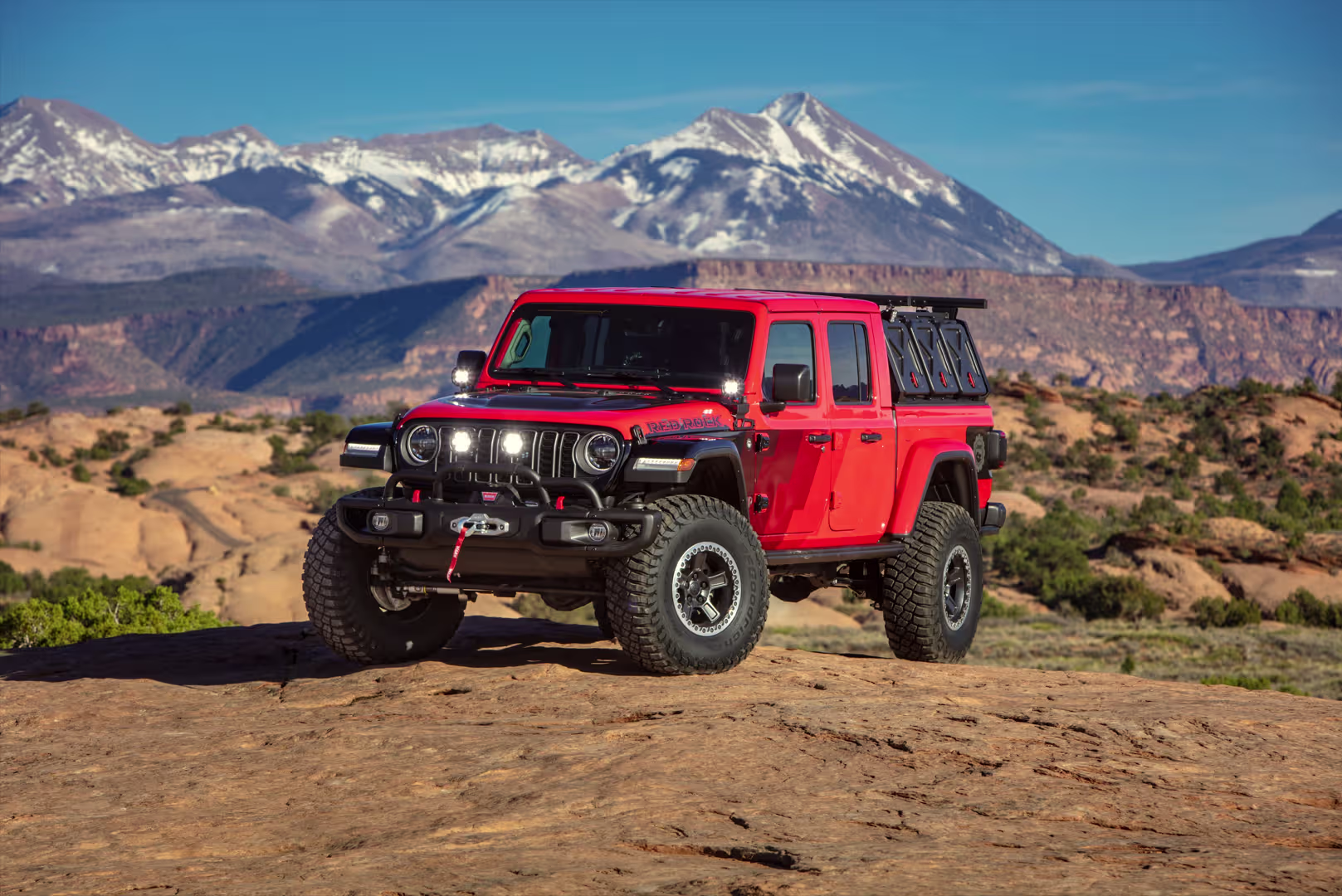 Jeep Gladiator Red Rock: configuração criada para apoiar preservação e manutenção das trilhas de Moab, com motor Pentastar V6 3.6, transmissão automática de oito marchas, rodas beadlock de 17 polegadas e pneus BFGoodrich KM3 de 37 polegadas.